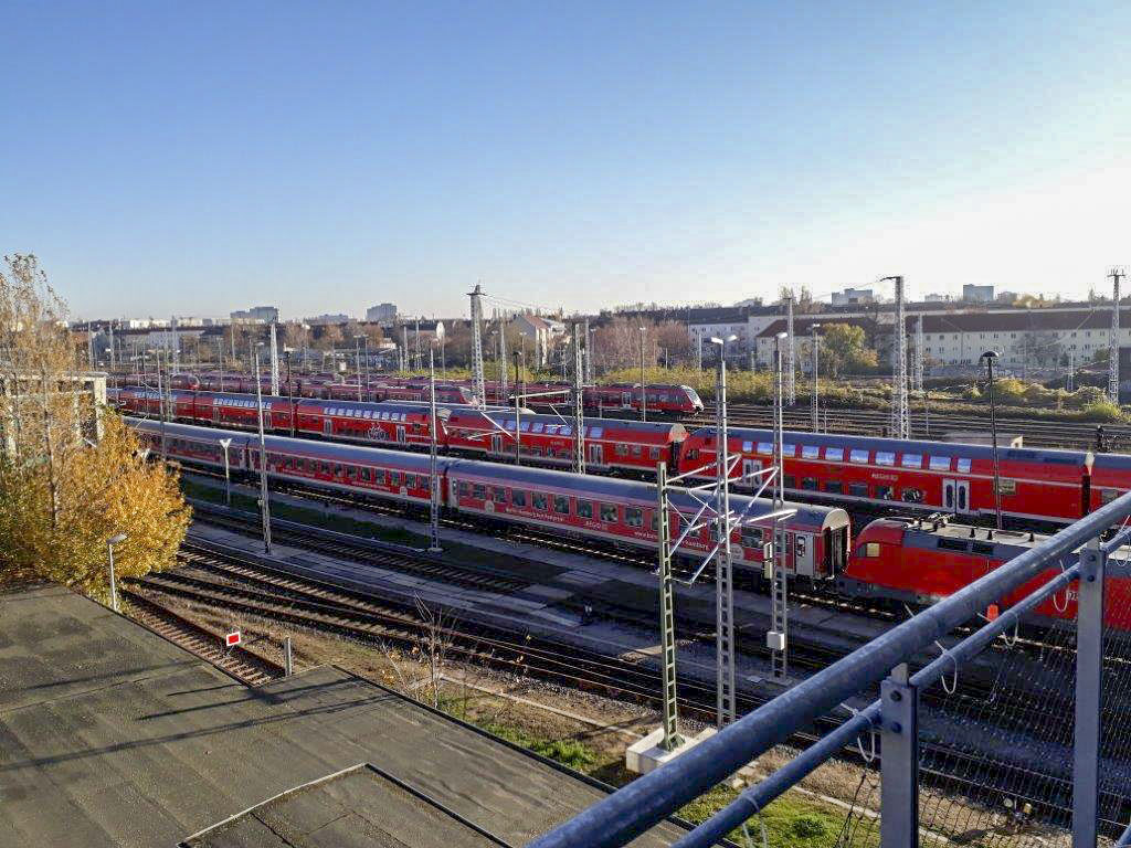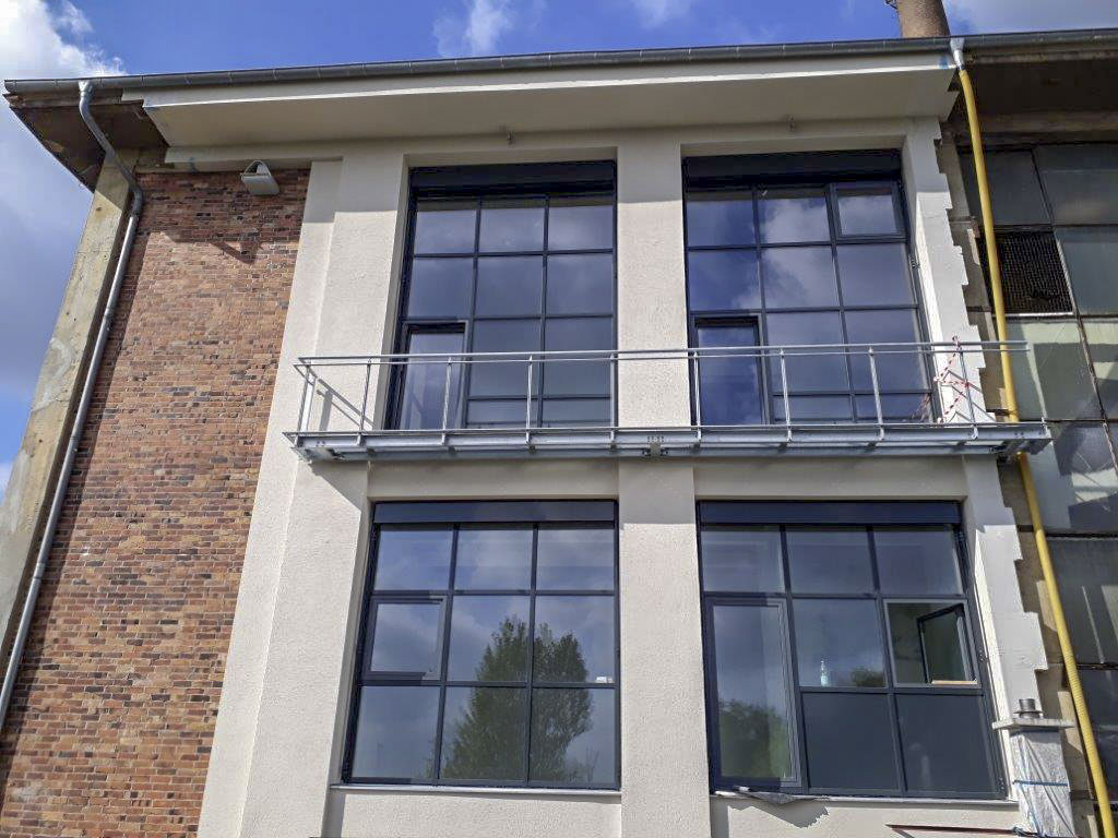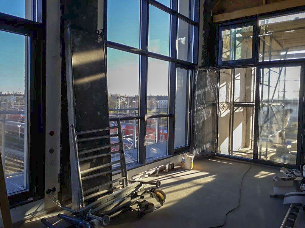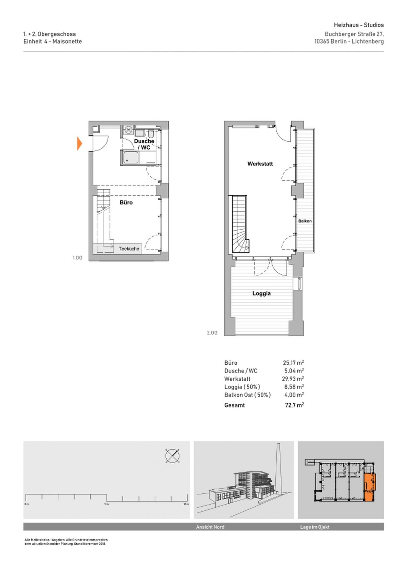 Das Studio 1.4 Maisonette Ost belegt zwei Etagen an der Süd-Ostseite des umgebauten Heizhauses. Die Außenfassaden sind bodentief mit modernen hochisolierenden Fenstern verglast. Im zweiten OG gibt ein Balkon an der Ostseite einen weiten Blick über die Lichtenberger Brücke frei.