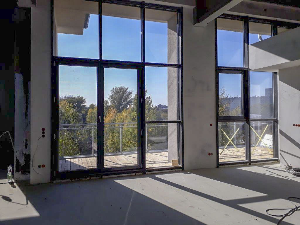 Drei bodentief verglaste Außenwände rahmen die Gesamtfläche von 138 m2 fast transparent ein. Im 2. Obergeschoss an der Westseite gelegen, bietet hier ein besonders großer West-Balkon von 22 m2 mitten in Berlin ganz unfassbare Horizonterfahrungen. Auch die Südseite hat eine etwa 1 m tiefe Balkon-Verlängerung mit befreiender Fernsicht.