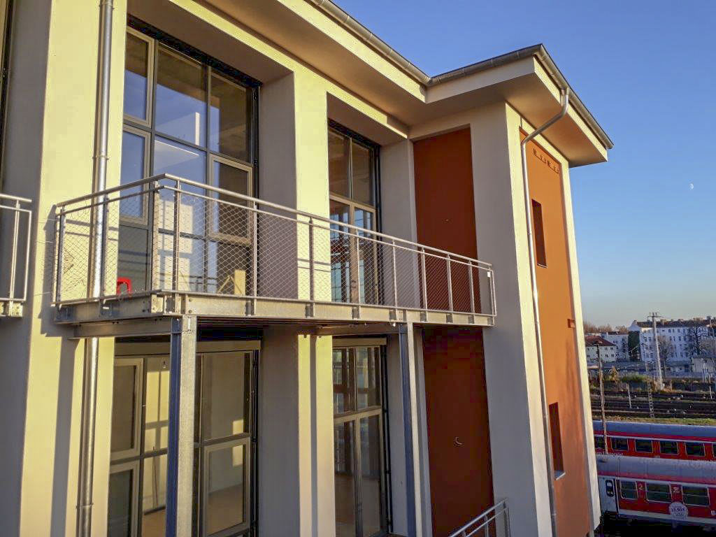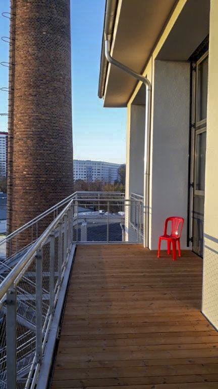 Heizhaus-Studio 2.1 Balkonansicht mit Schornstein