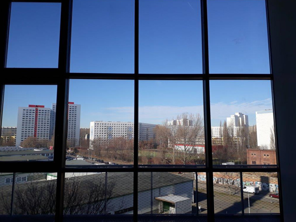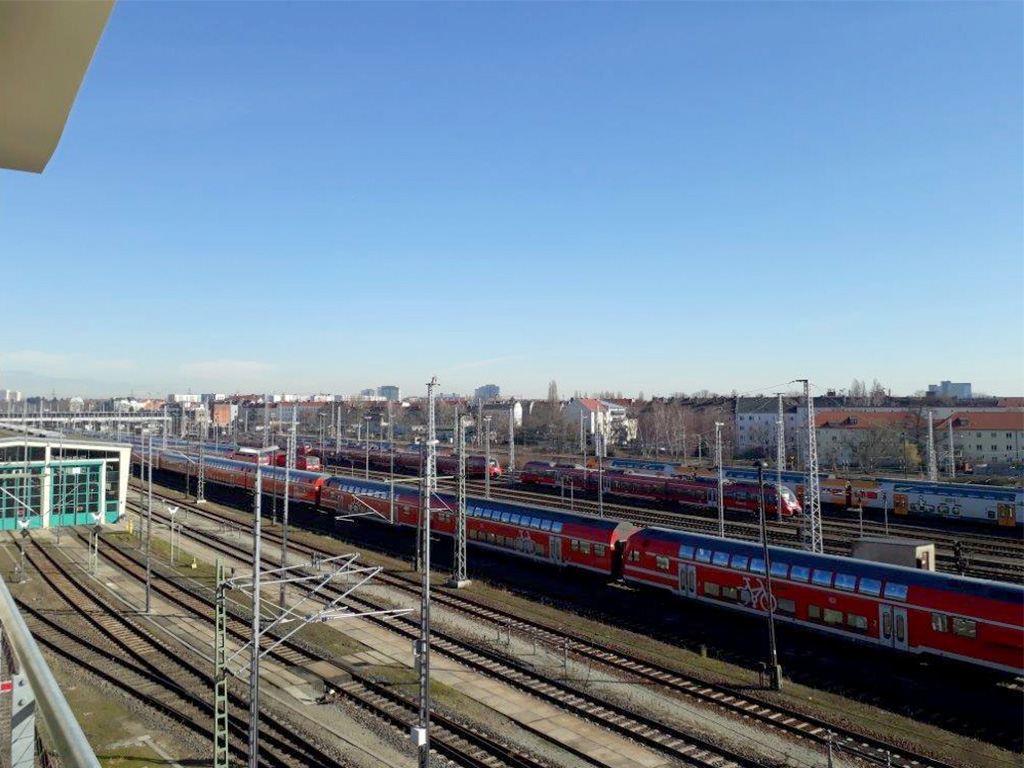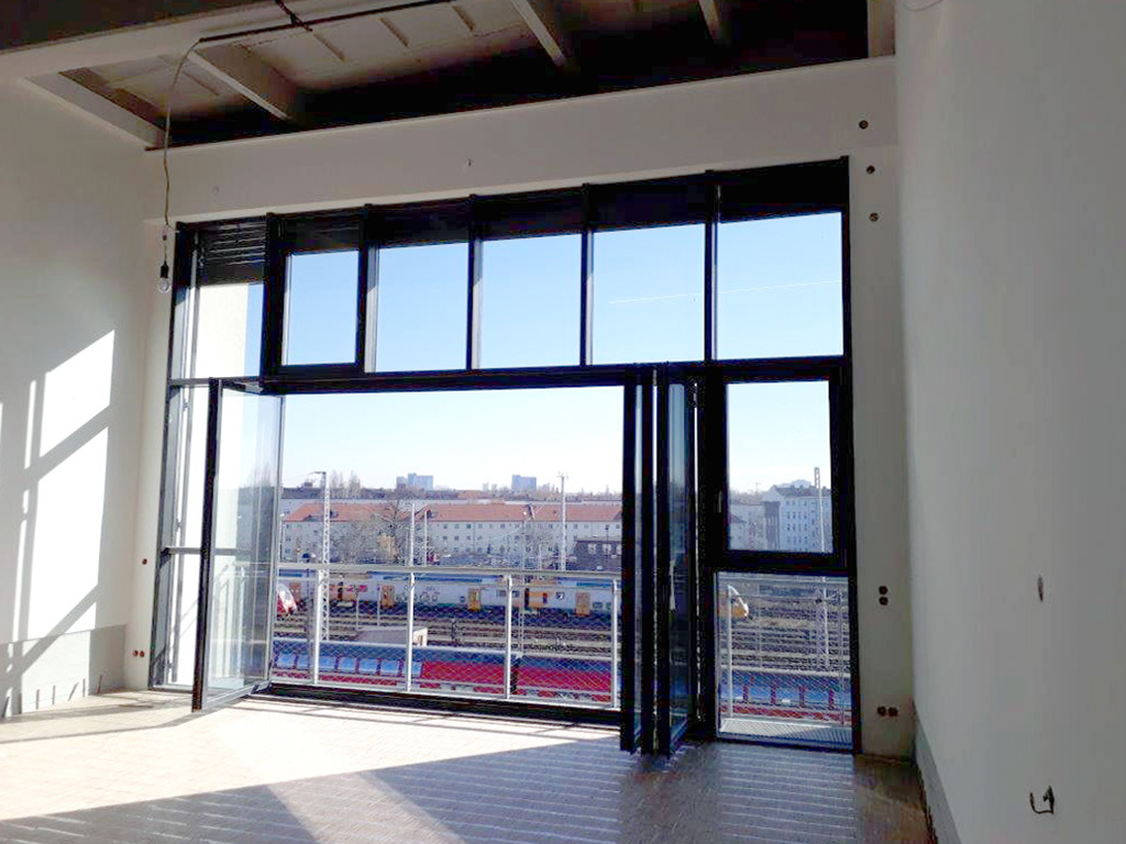 Eine riesige Arbeitsfläche von 68 m2 mit einem gewaltigen freien Ausblick über den Schienenstrom mit vollverglaster bodentiefer Südseite – mitten in Berlin. Die Originaldecke aus reliefbildenden Betonwaben der ehemaligen Industriehalle in 5,3 m Höhe bieten einen grandiosen Gestaltungsraum. Hinter der Glasfassade verlängert sich der Raum über einen die ganze Breite überspannenden Balkon. Komfortable Faltschiebeelemente öffnen über 4 m x 2 m die Atelierfläche ins Außen.